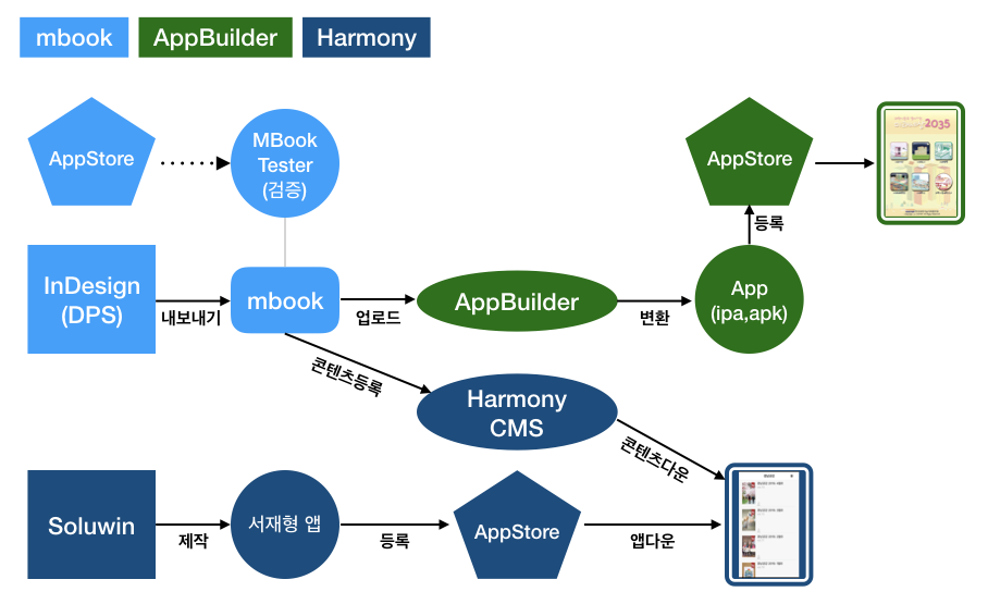 MBook Harmony와 Adobe DPS는 각각 앱북을 제작 할 수 있는 솔루션입니다. MBook Harmony는 Adobe와 달리 국내 앱북 솔루션이라는 장점이 있고, 구현할 수 있는 앱북 멀티미디어 기능도 Adobe DPS만큼 다양합니다. 사운드, 동영상 재생, 슬라이드 이미지, 웹 링크, 애니메이션 기능, 그외 인터렉티브한 기능을 퍼블리셔 마음대로 구현 할 수 있습니다.